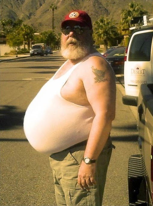 He said something I would never have expected, "I've been waiting forever for you to say something like that you punk!". Suddenly, I felt really weird. My tight stomach started to get really round and sag. I felt a scratching on my face and reached up to feel a thick, nasty full beard growin' in. I ran into the bathroom to see that it was a nasty whitish-blonde color. My arm tattoo tingled as it got a little smaller. My arms flabbed up and I could feel my fattening ass tear a hole in the back of my jeans.